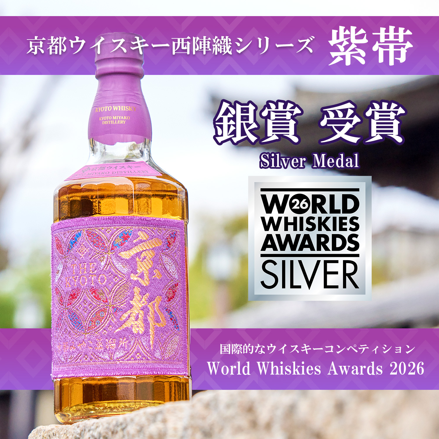 京都酒造株式会社(所在地:京都府船井郡京丹波町、代表取締役:豊田和也)の「京都ウイスキー西陣織シリーズ 紫帯」が、イギリスで開催されたWorld Whiskies Awards 2026(以下、WWA 2026)において、シルバー(銀賞)を獲得いたしました。